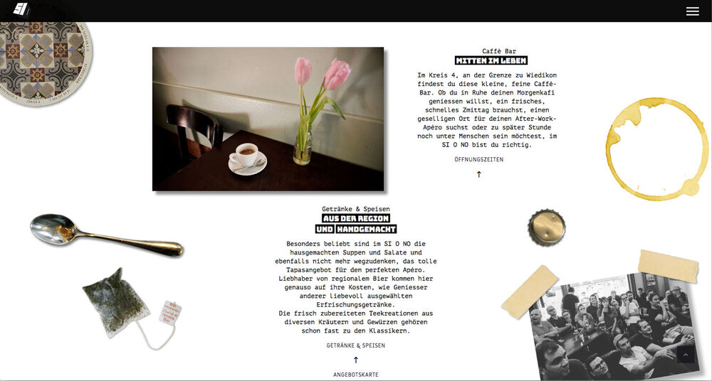 Im Kreis 4, an der Grenze zu Wiedikon findest du diese kleine, feine Caffè-Bar. Ob du in Ruhe deinen Morgenkafi geniessen willst, ein frisches, schnelles Zmittag brauchst, einen geselligen Ort für deinen After-Work-Apéro suchst oder zu später Stunde noch unter Menschen sein möchtest, im SI O NO bist du richtig.